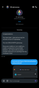 Over the weekend, I was informed that I had been selected as the winner of a prize of $10,000 in ETH. I was, of course, overjoyed and immediately provided my information to receive me prize. I’m kidding – No I was not and no I did not! I actually messaged back and forth with my potential benefactor for quite some time. He assured me that if I just paid the $30 in gas to his wallet (which I checked after he sent me the address and did not have $10k of Ethereum in it), he would be able to send the funds from his hardware. While it might be true that gas is needed for these transactions, if you are supposedly winning a prize, you should not have to pay anything in advance to receive that prize.