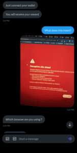 As you can see in the message screenshot on the right, I asked this particular scammer why he was sending me to a site that Chrome thought was suspicious. When he asked which browser I was using, I told him and then immediately tried the site in two other browsers. Both Edge and Brave flagged the site as malicious. This wasn’t just a case where the Web 2.0 browser didn’t recognize the legitimacy of a Web 3.0 site, as can sometimes happen, there is a real trust issue here.